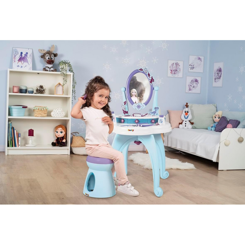 Der Frozen-Schminktisch enthält außerdem 10 realistische Accessoires : eine Halskette, einen Kamm, ein Haarband, drei Ringe, ein Armband und zwei Fläschchen. So wird ein abwechslungsreiches und anregendes Spielerlebnis ermöglicht. In den drei Schubladen lassen sich alle kleinen Schätze ordentlich verstauen, und Kinder lernen dabei spielerisch, Ordnung zu halten.