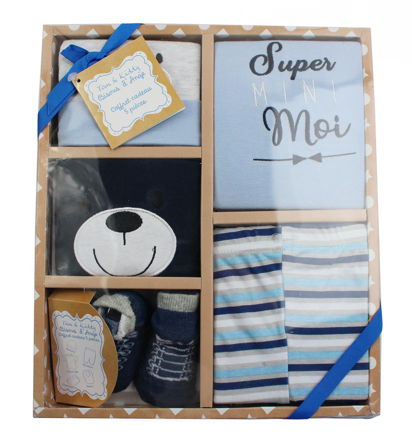 Das Tom & Kiddy Complete for Newborns - Super Mini Me ist ein Set mit T-Shirt, Hose, Mütze, Schuhen und Lätzchen in einer originellen Geschenkbox.